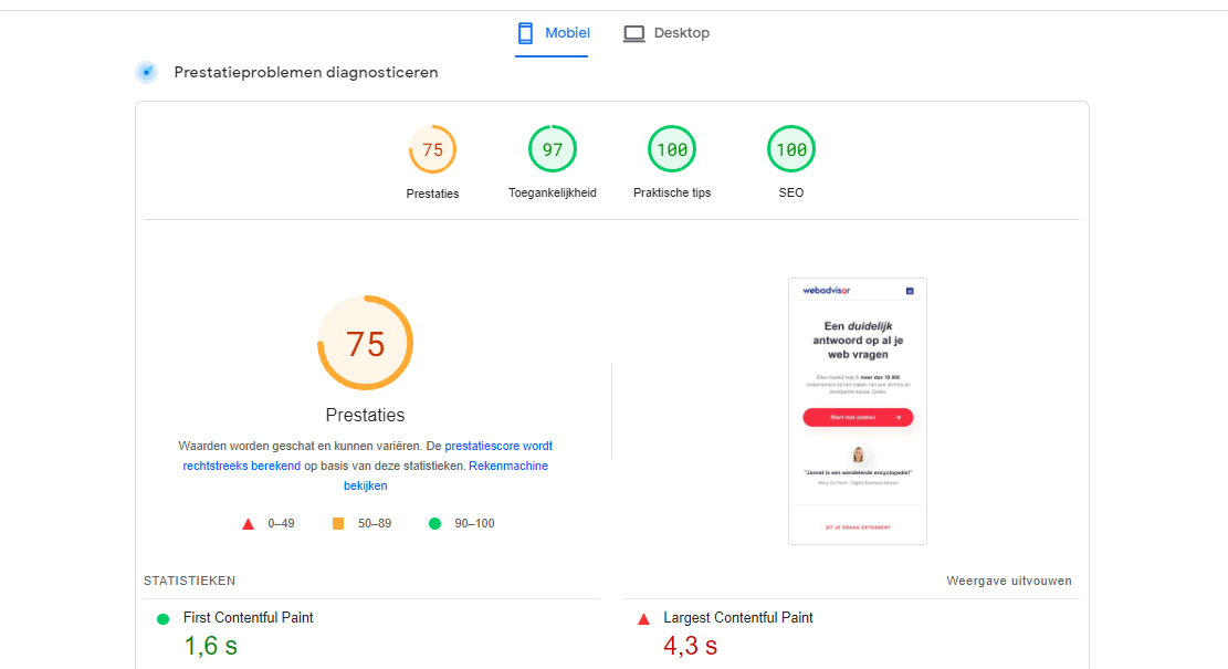 Voordat ik LiteSpeed op webadvisor.be had geinstalleerd, maakte mijn website gebruikt van de plugin WP Rocket op een Apache server. Mijn website had destijds een score van 75 op mobiel en een 89 op desktop via Google Pagespeed. Op zich was ik tevreden, al wist ik dat er verbetering in zat.